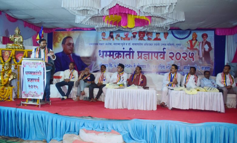 आंबेडकरी परिक्षेतून आजचा भारतीय विषयाला घेऊन आजच्या कार्यक्रमाचे प्रमुख वक्ते प्रोफेसर लक्ष्मण यादव यांनी धमक्रांती प्रज्ञापर्व हे जे शीर्षक देऊन आपण हा कार्यक्रम आयोजित केला तो निश्चितच क्रांतिकारक आहे या जगामध्ये सर्वात पहिले जर कोणी क्रांती केली असेल ते म्हणजे तथागत बुद्ध यांनी आणि त्यांच्या क्रांतीचा मार्ग होता तो म्हणजे प्रज्ञा शील करुणा या मार्गातून जाणारा मार्ग म्हणजे धम्मक्रांती आज संपूर्ण देशा मध्ये आणि राज्य राज्यांमध्येसंपूर्ण महाराष्ट्रात होणारे शेकडो कार्यक्रम आणि त्या कार्यक्रमातून निर्माण होणारी क्रांती रुपी समाजाचे कार्य देशाच्या कानाकोपऱ्यात पोहोचले पाहिजे. हात्मा ज्योतिराव फुले यांनी या देशांमध्ये सर्वात पहिले क्रांती करून महिलांना शिक्षण दिले क्रांतीज्योती सावित्रीबाई फुले यांना जो त्रास झाला त्याच मनुवादी विचारसरणीच्या लोकांनी आजच्या परिस्थितीमध्ये निर्माण झालेल्या चित्रपटाला सेन्सर बोर्डाद्वारे विरोध दर्शविण्यात येत आहे.एकीकडे महाराष्ट्र शासन फुले शाहू आंबेडकरांचे पुस्तक रुपी प्रकाशन करून शासन मान्यता देते आणि त्याच पुस्तकाच्या आधारावर निर्माण झालेला चित्रपट परंतु याच चित्रपटाला मात्र सेंसर बोर्ड विरोध करून महाराष्ट्र शासनाने प्रकाशन केलेल्या प्रकाशन खंडाला एक प्रकारे प्रश्नांकित केल्याचे काम करीत आहेत. १४ वर्ष दिल्ली युनिव्हर्सिटी मध्ये प्रोफेसर म्हणून काम केले परंतु विद्यापीठ प्रशासनाला हवे तसे काम होत नव्हते या देशामध्ये ज्या महामानवांनी प्रतिक्रांतीची जी बीजे रोली त्याचाच धागा धरून मी ते नोकरी करत होतो परंतु तेथील व्यवस्थेला मान्य नसल्याने आपण नोकरीचा राजीनामा दिला आणि महापुरुषाच्या विचाराची पेरणी करण्याचे काम आपण अहो रात्र संपूर्ण देशात करत आहोत आणि शेवटच्या श्वासापर्यंत करत राहणार असल्याची प्रतिज्ञा करणार असल्याचेही त्यांनी पुनरुचार केला असे ते शेवटी म्हणाले.यावेळी सर्व उपस्थित मान्यवरांना प्रज्ञापर्व समिती २०२५ चे ट्रॉफी शील्ड व पुष्पगुच्छ देऊन स्वागत करण्यात आले.यावेळी कार्यक्रमाचे प्रमुख वक्ते मा.प्रो. लक्ष्मण यादव, कार्यक्रमाचे अध्यक्ष डॉ. राजेश वाढवे, एडवोकेट आशिष देशमुख, डॉ. अकील मेमन, डॉ. मोहम्मद नदीम, प्रा. विलास भवरे, संजय कांबळे, रंगराव काळे, आत्माराम जाधव, प्रज्ञापर्व समिती २०२५ चे अध्यक्ष मिलिंद जाधव इत्यादींची प्रमुख उपस्थिती होती. या कार्यक्रमाचे संचालन, आर पी गवई तर आभार सुरेश कांबळे यांनी केले. या कार्यक्रमाला युवक महिला तरुण युवती बाल बालिका तथा धम्म बांधव मोठ्या संख्येने उपस्थित होते.