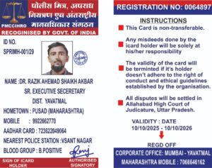 डॉ. राजिक अहेमद यांची पोलीस मित्र गुन्हे नियंत्रण आणि आंतरराष्ट्रीय मानवाधिकार संघटना, महाराष्ट्र राज्य, यवतमाळ जिल्हा.. वरिष्ठ कार्यकारीपदी निवड!