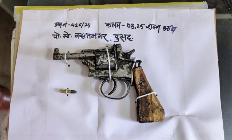 पुसद :   पोलीस स्टेशन वसंतनगर पुसद अंतर्गत गायमुख नगर हेलिपॅड जवळ गावठी कट्टा बाळगणाऱ्या हजरत बिलाल शेख मुसा (२१) रा. मधुकर नगर याला दि२५ डिसेंबर २०२५ रोजी अटक करण्यात आली आहे. गायमुख नगर ते हेलिपॅड मैदान परिसरात एक इसम संशयास्पदरीत्या बसलेला असून त्याच्याकडे देशी बनावटीचा गावठी कट्टा (रिव्हॉल्व्हर) आहे. या माहितीच्या आधारे सहाय्यक पोलीस निरीक्षक सुगत पुंडगे व त्यांच्या पथकाने पंचांसह घटनास्थळी धाव घेतली.हेलिपॅड मैदानाजवळ जाऊन पाहणी केली असता, एक इसम मैदानात बसलेला आढळून आला. पंचांच्या खात्रीने सदर इसमास ताब्यात घेण्यात आले.त्यास नाव-गाव विचारले असता त्याने नाव हजरत बिलाल शेख मुसा असे सांगितले. त्याची अंगझडती घेतली असता त्याच्याकडे गावठी बनावटीचा देशी कट्टा (रिव्हॉल्व्हर) व एक जिवंत काडतूस मिळून आले. सदर इसमाकडे अग्निशस्त्र बाळगण्याचा कोणताही वैध परवाना नसल्याचे निष्पन्न झाले. या प्रकरणी पोलीस स्टेशन वसंतनगर पुसद येथे आरोपीवर अवैधरित्या अग्निशस्त्र बाळगणे या गुन्ह्याखाली गुन्हा दाखल करण्यात आला आहे. पोलीस अधीक्षक कुमार चिंता, अपर पोलीस अधीक्षक . अशोक थोरात यांच्या मार्गदर्शनाखाली तसेच सहाय्यक पोलीस अधीक्षक तथा उपविभागीय पोलीस अधिकारी हर्षवर्धन बी.जे. (पुसद उपविभाग) व पोलीस निरीक्षक सतीश जाधव पो.स्टे. वसंतनगर पुसद यांच्या आदेशानुसार कार्यवाही करण्यात आली.कारवाईत सहाय्यक पोलीस निरीक्षक सुगत पुंडगे, पोलीस उपनिरीक्षक शिवानंद स्वामी, अशोक चव्हाण, प्रफुल्ल इंगोले, सुरेश राठोड, श्रीकांत राठोड यांनी सहभाग घेतला. सदर गुन्ह्याचा पुढील तपास पोलीस उपनिरीक्षक शिवप्रसाद आवळकर करीत आहेत.